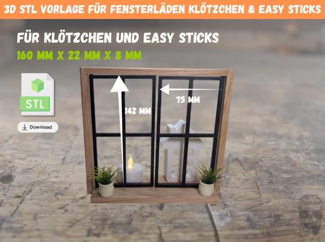 Diese digitale 3D-Druck Datei (STL) ermöglicht dir das Drucken von Fensterläden, Klappläden und Türen, perfekt abgestimmt auf Klötzchen und Easy Sticks. Ideal für DIY Deko, Bilderrahmen als Fenster, kreative Wanddeko oder dekorative Dekoaufsteller mit Türen.