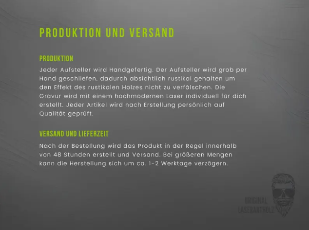 Die Holzmaserung kann den Kontrast der Gravur leicht beeinflussen – darauf haben wir keinen Einfluss.