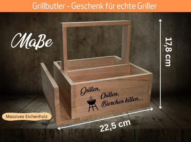 Die hochwertige Grillbox aus Klötzchenholz ist ein absoluter Blickfang bei jedem Grillabend – und sorgt als Geschenk garantiert für einen echten OHA-Effekt.