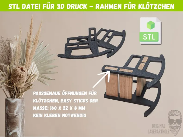 Mit dieser STL-Datei für den 3D-Druck erstellst du passgenaue Rahmen für deinen Klötzchen-Schaukelstuhl – kompatibel mit klassischen Klötzchen oder Easy Sticks.