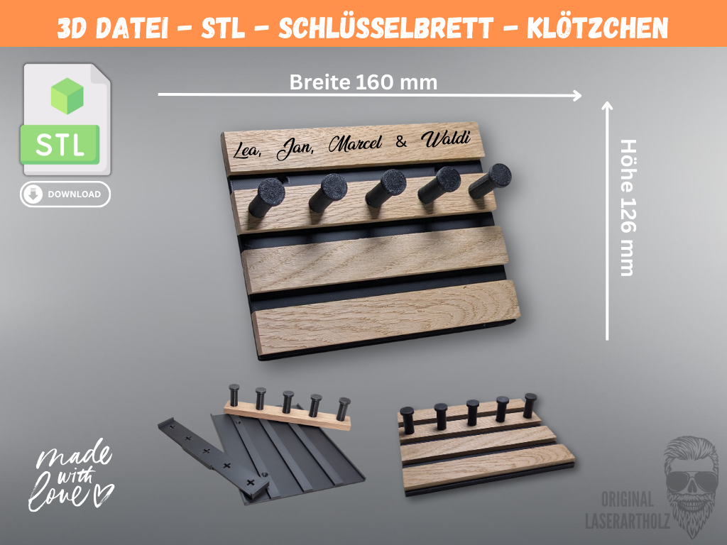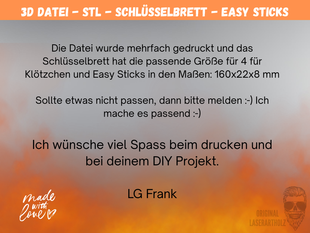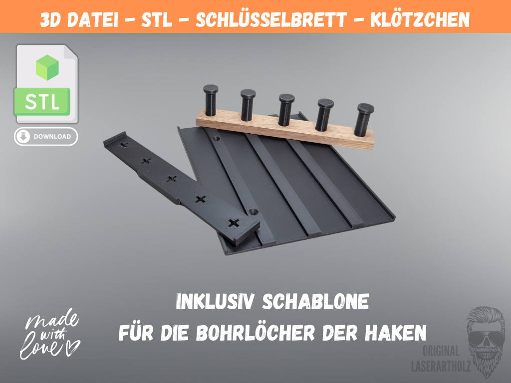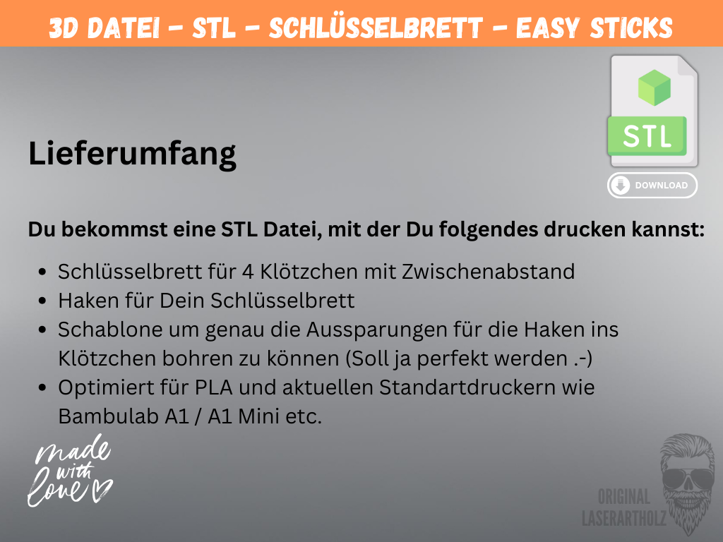 1x STL-Datei mit Schlüsselbrett für Klötzchen oder Easy Sticks – 1 Schablone für die Haken – Haken für die Klötzchen.
