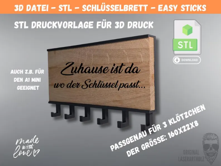 Schlüsselboard / Schlüsselbrett | 3D-Druckvorlage für Klötzchen-DIY | STL-Datei für Easy Sticks oder Klötzchen