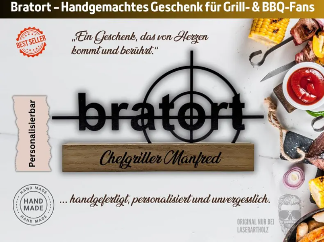 Personalisierter Aufsteller „Bratort“ – Geschenk mit Wunschtext | Deko Küche, Grill, BBQ, Humor
